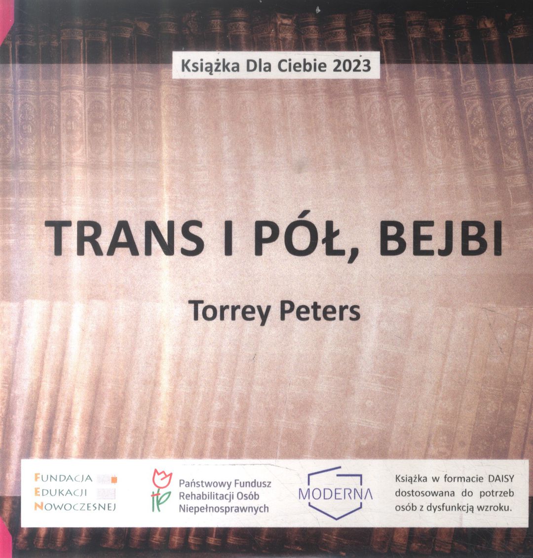 Trans i pół, bejbi [audiobook] / Torrey Peters. - Warszawa : Fundacja Edukacji Nowoczesnej ; [Jelenia Góra] : Fundacja Moderna, 2023. - 1 płyta audio (CD) : zapis cyfrowy, stereo ; 12 cm.