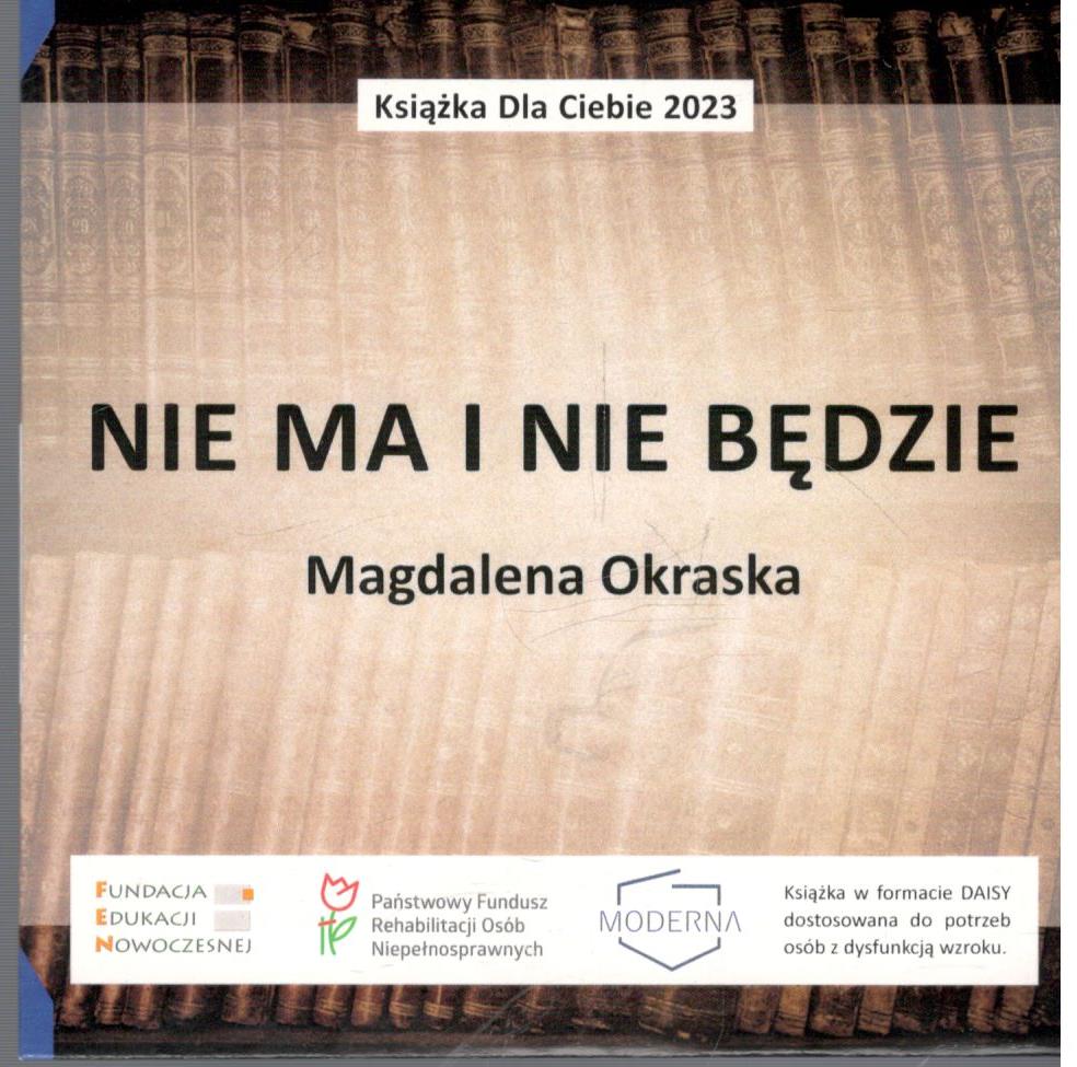 Nie ma i nie będzie [audiobook] / Magdalena Okraska. - Warszawa : Fundacja Edukacji Nowoczesnej ; [Jelenia Góra] : Fundacja Moderna, 2023. - 1 płyta audio (CD) : zapis cyfrowy, stereo ; 12 cm.