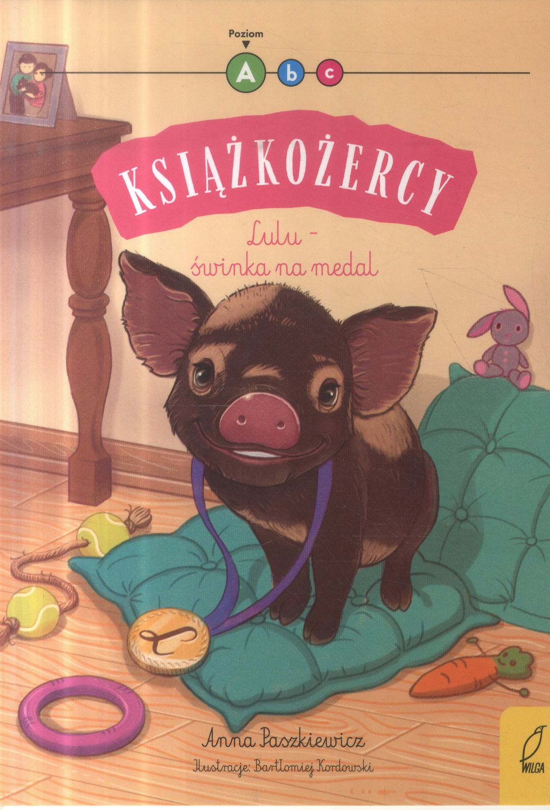 Lulu to świnka wietnamska z Pensylwanii w Ameryce, która w 1998 rok stała się sławna na całym świecie. Uznano ją za bohaterkę, ponieważ uratowała życie swojej właścicielki, gdy ta dostała zawału. W jaki sposób udało się tego dokonać temu wyjątkowemu zwierzęciu? Tom "Lulu – świnka na medal" na poziomie A przeznaczony jest dla Książkogryzaków, czyli dzieci, które poznały lub są w trakcie poznawania wszystkich podstawowych liter, uczą się składać z nich proste słowa, rozumieć sens prostych zdań, nie znają lub dopiero poznają litery ze znakami diakrytycznymi oraz dwuznaki i podejmują pierwsze próby samodzielnego czytania. Książki na poziomie A zawierają historyjki idealne do pierwszych prób samodzielnego czytania, proste słowa z jak najmniejszą liczbą dwuznaków i liter ze znakami diakrytycznymi, przewagę zdań pojedynczych, od jednego do trzech zdań na każdej stronie.